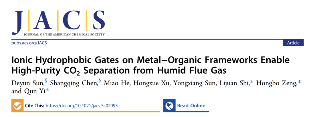 本网讯(通讯员 陈尚清 史利娟)近日,英国365集团网站绿碳技术与智能材料团队在化学领域国际顶级期刊Journal of the American Chemical Society上发表了题为“Ionic Hydrophobic Gates on Metal-Organic Frameworks Enable High-Purity CO2 Separation from Humid Flue Gas”的研究论文。Journal of the American Chemical Society(影响因子15.6)是全球化学领域最具影响力的学术期刊之一,长期位列中科院化学大类1区,具有极高的学术声誉和影响力。英国365集团网站为该论文第一署名单位,绿碳技术与智能材料团队博士研究生孙德贇、青年教师陈尚清博士为论文共同第一作者,史利娟教授、加拿大阿尔伯塔大学曾宏波院士、易群教授为论文共同通讯作者。