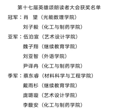 经过两轮的激烈角逐,共有10名同学脱颖而出,分别荣获一等奖、二等奖、三等奖。15名参赛选手获得优秀奖。他们或以真挚的赞美之情令人动容,或以纯熟的朗诵技巧让人折服,或以激昂的表演风格使人振奋。一位位英雄的形象通过他们的朗读变得更为立体、更加伟岸。此间山河,百代过客。月落参横,万古长青。12月12日,化药公司第十七届“英雄颂”汇报演出即将在图灵报告厅拉开帷幕,我们不见不散!