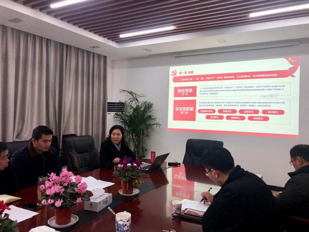 王雪梅从《条例》出台背景意义、基本框架、贯彻和实践要求三个方面进行了深入细致的解读。王雪梅指出《条例》是我们党历史上第一部关于党支部工作的基础主干法规,是新时代党支部建设的基本遵循。《条例》的制定和实施,对于加强党的组织体系建设,推动全面从严治党向基层延伸,全面提升党支部组织力、强化党支部政治功能,巩固党长期执政的组织基础,具有十分重要的意义。王雪梅就公司落实《条例》,抓好党支部建设具体提了三方面的要求:一、要高度重视,抓好《条例》的学习宣传和贯彻落实。各党支部要通过专题研讨、集中培训等方式,深入领会《条例》精神,全面掌握《条例》内容,切实增强贯彻执行《条例》的思想自觉和行动自觉;二、要履行好党支部的职责,加强党支部标准化、规范化建设。各党支部要结合自身特点,明确自身职责任务,做好《条例》中支部建设的“规定动作”,发挥好管理服务、带动引领作用,不断提高党支部建设质量;三、要坚持围绕中心抓党建,抓好党建促进校院发展,让党建工作与业务工作相辅相成、互相促进,相得益彰。