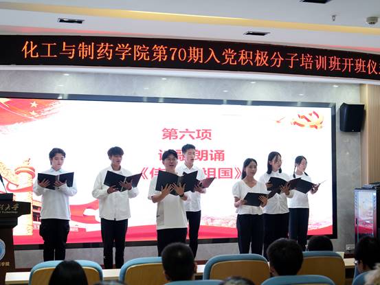 新生积极分子代表在奋进的音乐声中为全体学员们带来诗歌朗诵《伟大的祖国》,时代青年茂风华,传承精神谱新章,同学们以满腔热情歌颂了伟大的祖国,展现了青春激昂的风采。
