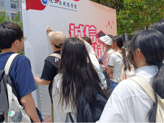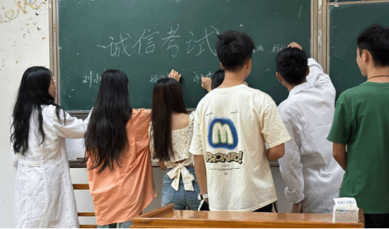 公司在教学楼前开展诚信考试签名活动,号召全体员工做遵规守纪、以德立身、明礼诚信的新时代老员工。