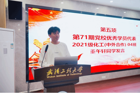 第71期优秀学员代表2021级化工与制药类04班董午轩同学对公司党委提供的学习、交流平台表示感谢,并呼吁本期学员要加强个人修养,深化党性意识,要用党员的要求严格要求自己。