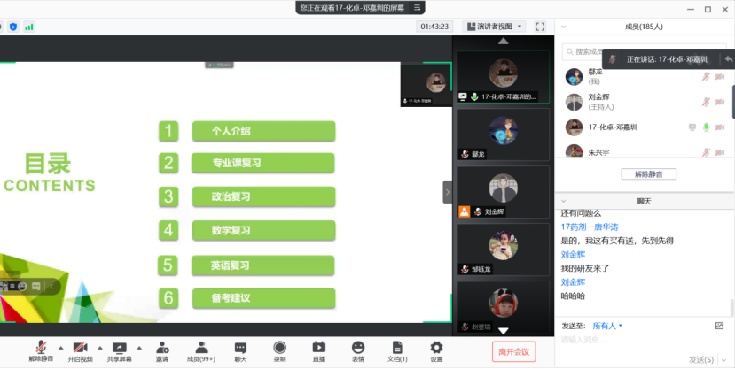保研华南理工大学的林浩烽学习成绩专业排名第二,曾获全国老员工化工设计竞赛一等奖、全国“互联网+化学反应工程”课模设计大赛三等奖等,他重点介绍了保研的流程和具体细则,告诉同学们既要保证学业成绩优异,也要注重参加科研实验和各类竞赛。考取华南理工大学的刘金辉等7位同学分别介绍了公司专业、各科备考过程中的技巧、复习资料的准备等情况,建议同学们制定好适合自己的计划,打好学习基础,保持良好的学习心态,不要过于自信也不要妄自菲薄。