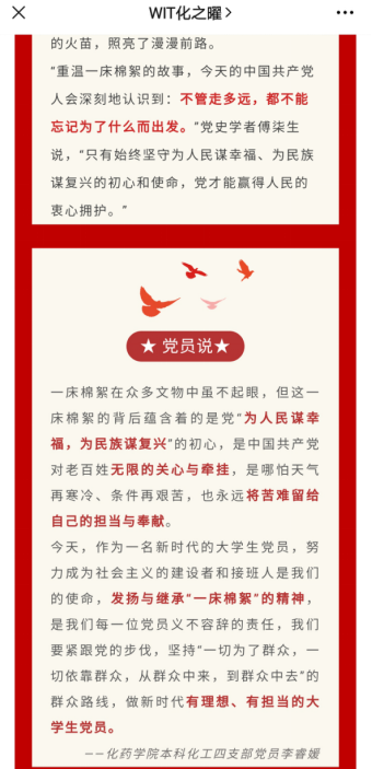 团支部同学申请入党率达100%,经过组织考察发展,现有中共党员2人,中共预备党员3人,入党积极分子13人,中共党员、入党积极分子比率为60%,中国共青团作为中国共产党领导的先进青年的群众组织,应主动承担历史使命,履行义务,服务集体,服务同学。化卓团支部的同学们通过学习党的方针路线、政策等,做到积极响应号召,投身志愿服务事业。无论是校园中的一次小小的志愿活动,还是疫情期间各地的志愿者服务,都有本支部同学的身影。这些活动无论有无学分,大家都主动报名参加,真正做到主动地帮助他人、为他人服务。疫情居家期间,支部多次展开线上会议,分享防疫知识与战疫心得,诉说着抗疫期间的点点滴滴;在疫情防控斗争面前,支部成员赵能闯、李睿媛积极响应号召,主动参与到社区的疫情防控工作中,进行信息登记和志愿者奖励发放等工作,勇敢地担起了防疫志愿者工作,完成了一份特殊的“寒假作业”,在家乡防控“疫”线唱响了青春之歌。赵能闯、李睿媛获得校“抗疫先进个人”荣誉称号。