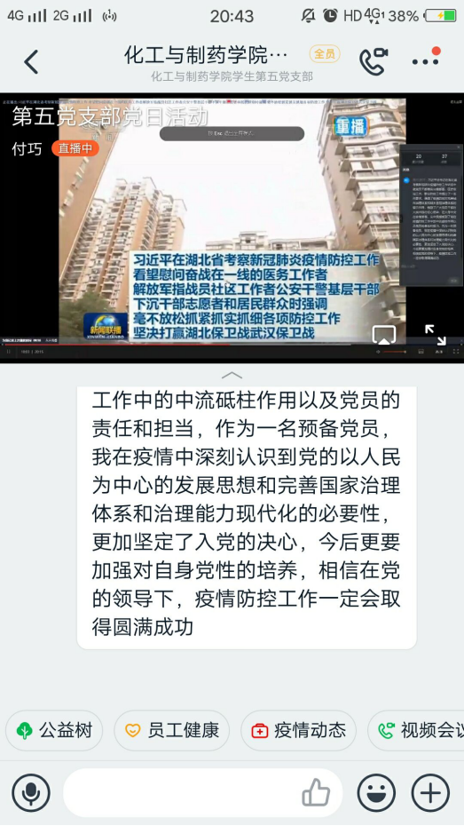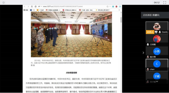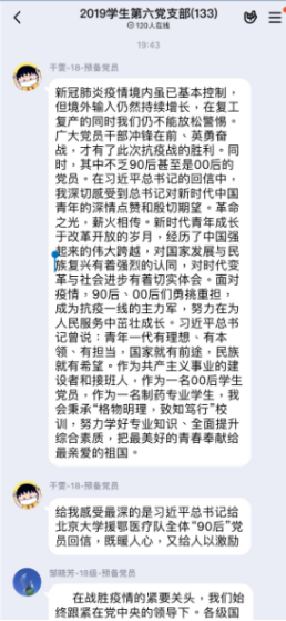 各党支部书记强调员工党员们在做好个人防护、坚决服从党组织安排的基础上,充分发挥好青年党员先锋模范作用,坚决贯彻落实党中央和公司、公司党委对疫情防控的部署要求,同时也提醒支部党员做好学业规划、扎实开展线上学习,疫情期间思想不掉队、学业不掉线。