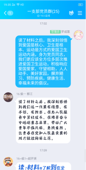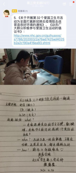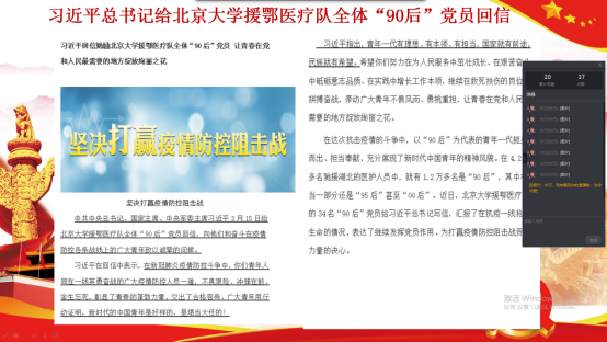 主题党日活动期间,各党支部书记在支部微信群、QQ群就“防疫有我,爱卫同行”为主题为支部党员们讲授了一次线上微党课。党课传达学习了习近平总书记在湖北省考察新冠肺炎疫情防控工作时的讲话精神、习近平总书记在4月8日召开的中共中央政治局常务委员会会议上的讲话精神等重要内容,将深入学习习近平总书记讲话精神与爱国主义教育、责任教育、生命教育、感恩教育等主题教育结合,推动主题党日活动往深里走,往实里走,往心里走。