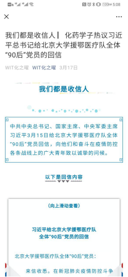 2020年3月15日,习近平总书记给北京大学援鄂医疗队全体“90后”党员回信,向他们和奋斗在疫情防控各条战线的广大青年致以最真挚的问候。一个月以来,化药员工党员深刻学习回信精神,各党支部围绕回信内容进行学习交流、分享心得,畅谈学习回信的体会、感悟和奋斗决心。