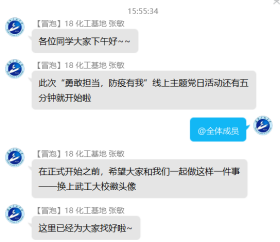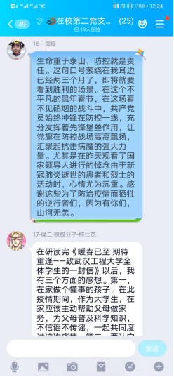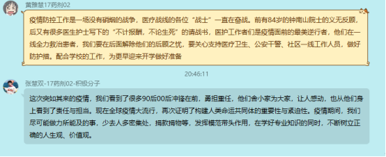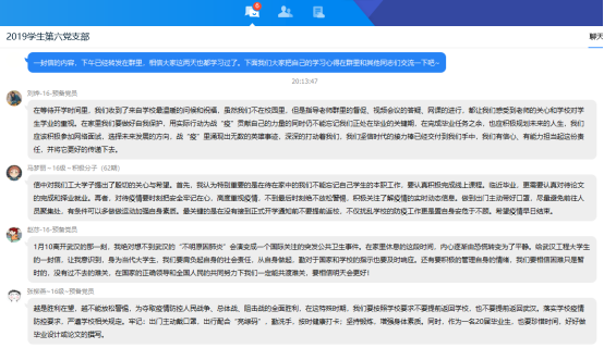 线上会议期间,各支部党员积极开展讨论,凝聚了正能量。员工党员们围绕最美逆行者的先进事例和身边亲友的抗疫事迹,结合化工、制药专业特色以及员工党员身份,谈认识、讲体会、话担当,进一步增强了责任感和使命感。本科五支部的叶令飞同学表示,将充分发挥党员先锋模范作用,自觉遵守相关防控要求,尽己所能为家乡贡献力量;本科六支部的毕业生党员赵莎同学表达了自己的抗疫决心,表示将积极响应公司号召、认真备战考研,自觉恪守员工党员本分,不负青春韶华;本科七支部的张慧双同学表示,疫情期间将尽可能做力所能及的事情,在学好专业知识的同时,不断树立正确的人生观、价值观。