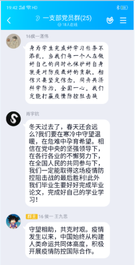 “珍惜当下,体味生命的温度;努力上进,增加生命的厚度”“愿山河无恙,致敬抗疫一线的英雄”,员工四支部19位员工党员借助笔和纸,用最常见却最温情的方式道出心声,表达青年学子身体力行、防疫有我的必胜决心,用朴实的语言表明自己居家防疫、做好线上学习的坚定态度。员工一支部、二支部在支部书记的号召下,通过QQ群,开展了“我为抗疫英雄献花”的云献花活动,支部党员全员参与,在云端寄托员工党员对抗疫英雄们的哀思和感激之情。