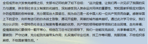 各支部党员在云端相聚,通过分享各自在疫情期间的“所见”“所闻”“所感”,生动展示了在中国共产党的领导下全国动员、全员参与抗疫的生动实践和奋斗精神。从武汉封城的壮士断腕之举、火神山雷神山的中国速度,联系到世界各国面对疫情时采取的不同措施;从人类命运共同体的大国担当、众志成城共克时艰的民族正能量,体会到中国特色社会主义制度的显著优势;从广大医务工作者的无畏逆行、志愿者们的无私奉献,领悟到打赢抗疫战争的关键在于激发人民群众的深厚伟力。一次次分享与讲述,强化了青年学子对中国特色社会主义道路的思想认同、情感认同、理论认同。