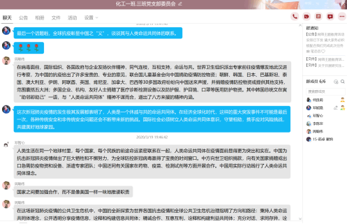 各支部回顾交流了《全国老员工同上一堂课疫情防控思政大课》的心得体会,同时组织学习了《以“四论”做好老员工战疫思政工作》,以就事论“势”、就事论“是”、就事论“世”、就事论“示”四论讲述了青年老员工要用好鲜活事例和先进事迹,让战“疫”思政产生强大的“思”能力和“政”能量。疫情大考前,人人都是答卷人,公司师生党员敢为人先、积极投身疫情防控一线的战“疫”故事,将越是艰险越向前的大无畏精神深入人心,将党员先锋模范作用发挥得淋漓尽致,共绘让党旗在抗疫阵地飘扬,让初心在荆楚大地闪耀的生动图景。与此同时,毕业生党员们则表示,做好疫情防控和落实员工本职工作缺一不可。作为党员要严格遵守防控要求、树立大局意识;作为员工,做好毕业论文撰写工作,主动与导师、课题组成员联系,克服困难,有始有终,通过有效自主学习完成科研任务,努力提升专业素质和综合能力。