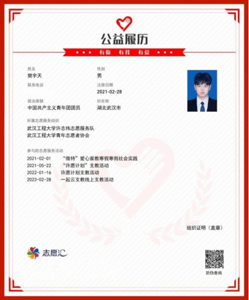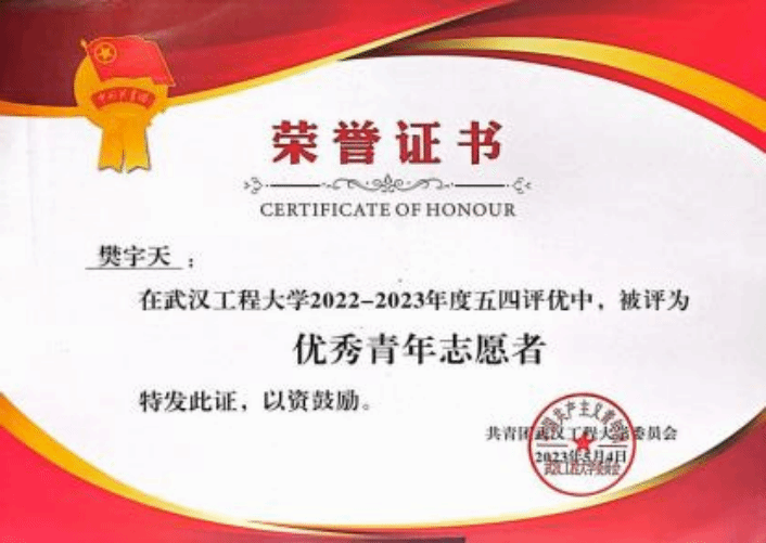 作为一名党员,樊宇天始终牢记全心全意为人民服务的宗旨,始终坚持将志愿服务精神转化为“融入日常、化作经常”的微小实践行动。他大学入学就加入了许志伟志愿服务队,参加了两期“许愿计划”支教活动、“微特”爱心家教活动、公司“一起云支教”活动,根据个人特长和专业优势,精心设置课堂内容,为小朋友教授趣味化学、英语口语、爱国教育等方面课程,用爱心和知识在孩子们心中播撒一颗梦想的种子。