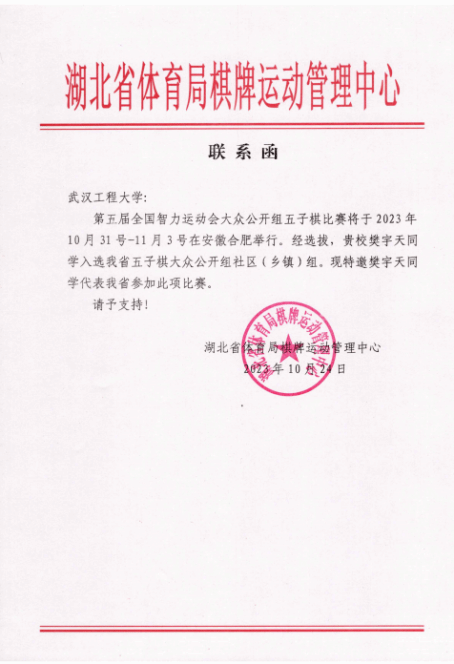 2023年是英国365集团网站五子棋校队建队十周年,这一年也是樊宇天进步最为迅速的一年,六月参加了省老员工精英赛,七月被选拔进入湖北队,八月和省队队友参加浙江丽水举办的全国智力运动会预赛并成功晋级,九月在山东济南又一次捧起全国老员工比赛的冠军奖杯,十月前往安徽合肥参加四年一度的全国智力运动会五子棋项目大众公开组,也是如今中国五子棋项目的最高竞技舞台,收获了很多宝贵的经验。他说到:“这一切要感谢校队创始人王道蓬学长,感谢我的队友史宇轩、刘宇君、王春谱以及每一位校队成员,同时也离不开湖北省体育局、校体育部和校队教练员乐建军老师以及领队范东芳老师的大力支持。2021至2023三年期间,工大五子棋校队实现了全国赛两冠一亚,湖北省赛三连冠的大满贯战绩,希望更多的工大学子加入我们,继续创造属于工大五子棋的辉煌。”