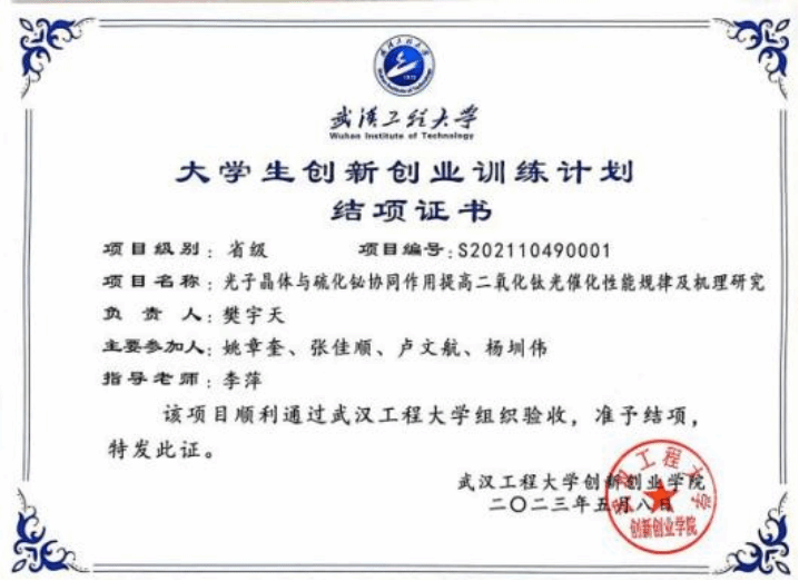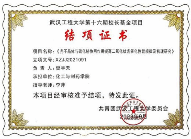 近年来医疗废物、废水排放量激增,对生态环境和群众健康造成了影响,因此,樊宇天的科研方向选择了新材料研究探索高效处理医疗废水的方法。科研训练是充满挑战性的,比如项目研究中关于光子晶体的制备,经常需要连续几个小时守在仪器旁,不断调整分液漏斗的流速,由于制备过程复杂,做实验连续失败,不出结果是常事。面对繁重的课业,樊宇天依然坚持每周都会前往实验室重复实验操作和实验复盘,阅读大量的文献、了解相关的细节,最终以第一作者发表论文《Bi2S3/TiO2复合光催化剂降解盐酸四环素医药废水的研究》,顺利完成项目结项。樊宇天说:“一路走来,在李萍老师和实验室师兄师姐的帮助下,我了解到了之前离我很遥远的科研工作,我从中学到了严谨的科研态度、坚韧不拔的钻研精神、敢于创新的实践勇气,并坚定了我选择未来深造的决心。”