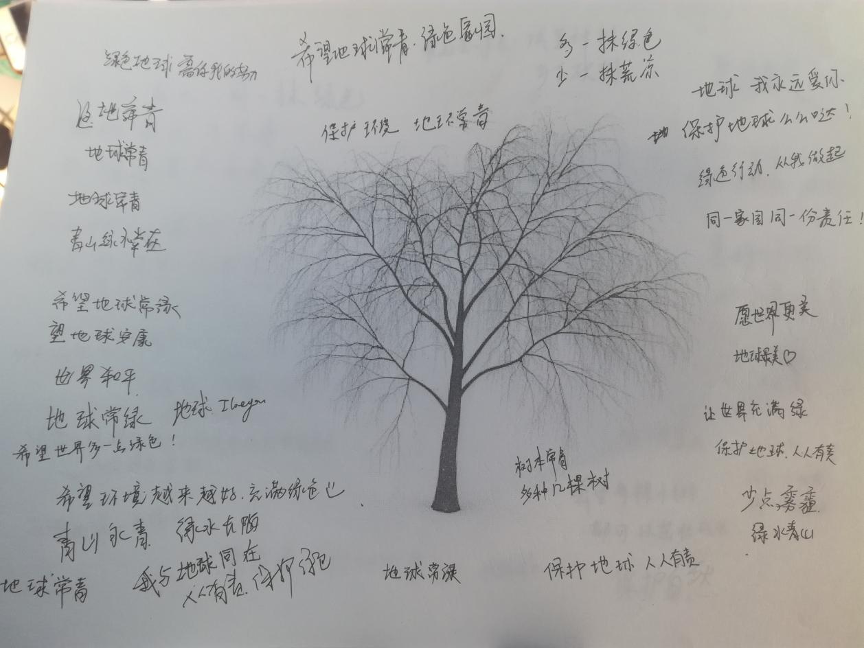 本次活动吸引了来自全校1500多人的参与,同学们纷纷在纸上写下自己对地球的美好祝愿。大家都希望“地球长青,绿色常在”、表达了“绿色家园,从我做起”的心愿。