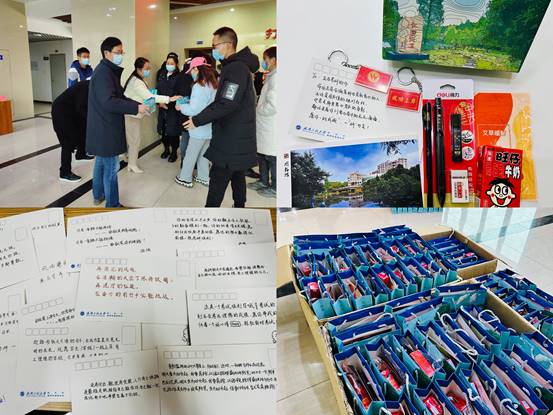 随后汪铁林、周丹向同学们送上了考研大礼包,包括暖宝宝、涂卡笔、旺仔牛奶、公司定制的“成功上岸”纪念钥匙扣以及写满学弟学妹们祝福语的明信片。