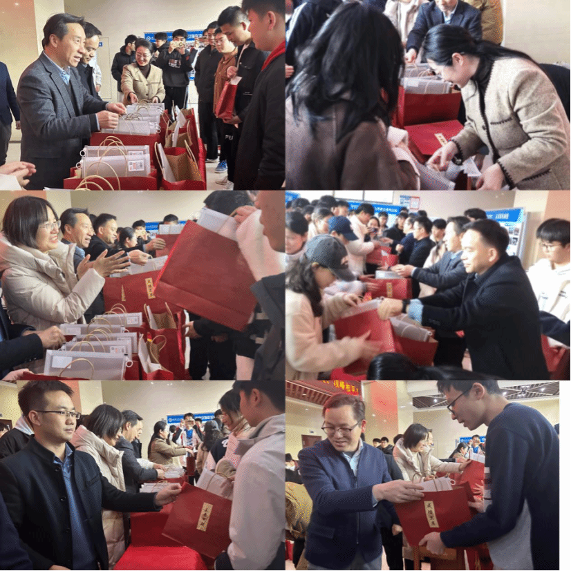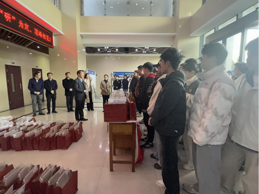 随后,杨海波等一行为同学们送上考研大礼包,红红火火的礼包袋上贴有“金榜题名”“前程似锦”“成功上岸”等祝福标签,内有考试文件袋、数学演草本、英文作文纸等实用文具,印有“未来可期”“一研为定“金榜题名”且带公司logo的祝福钥匙扣、学弟学妹给学姐学长手写的祝福明信片及寓意“笑哈哈‘的娃哈哈饮品,每一样物品都承载着公司对学子们无微不至的关怀、鼓励与祝福。同学们纷纷表示,一定会全力以赴,以饱满的精神状态迎接即将到来的考试,回报公司公司的悉心栽培和暖心关怀。