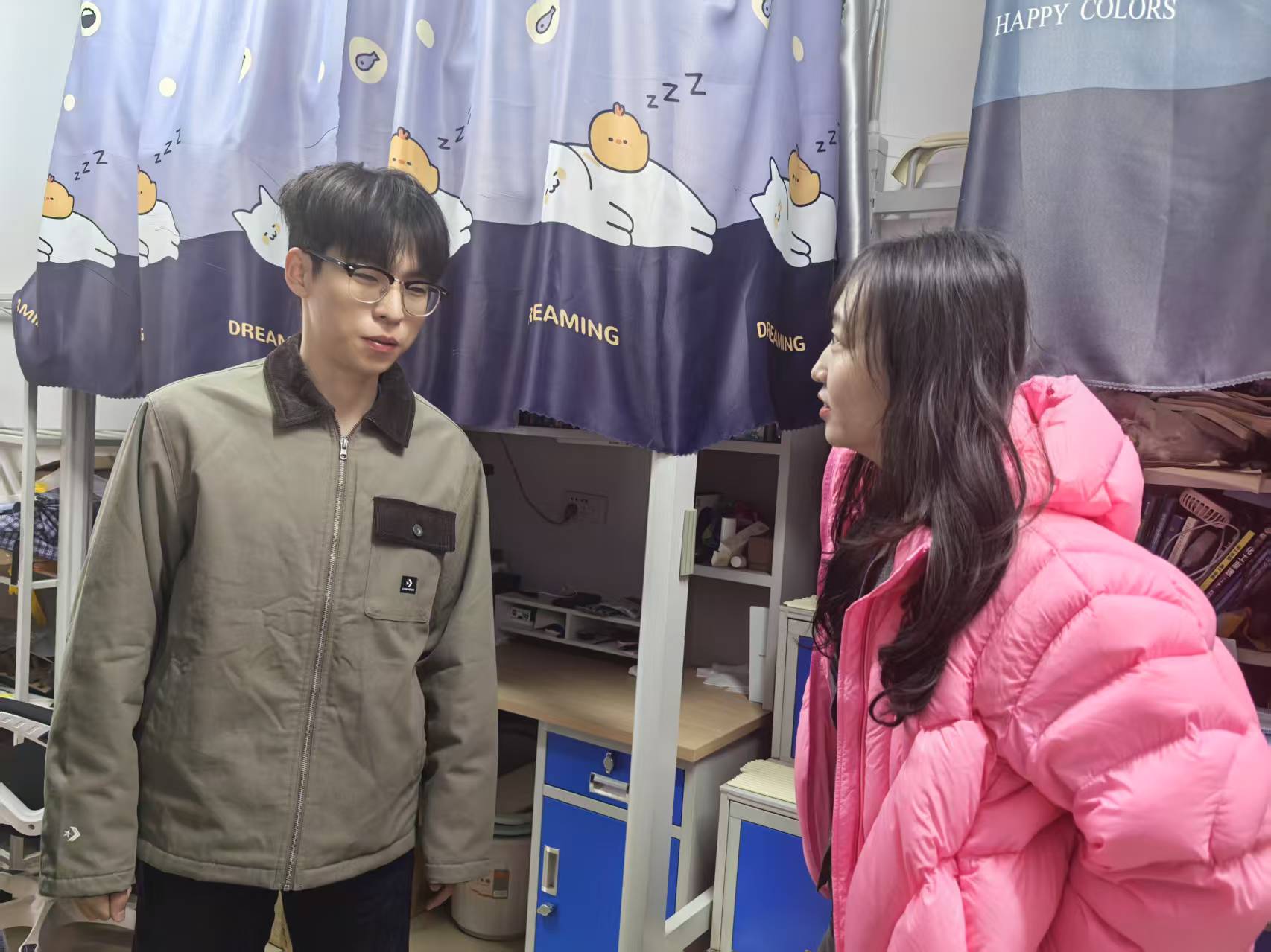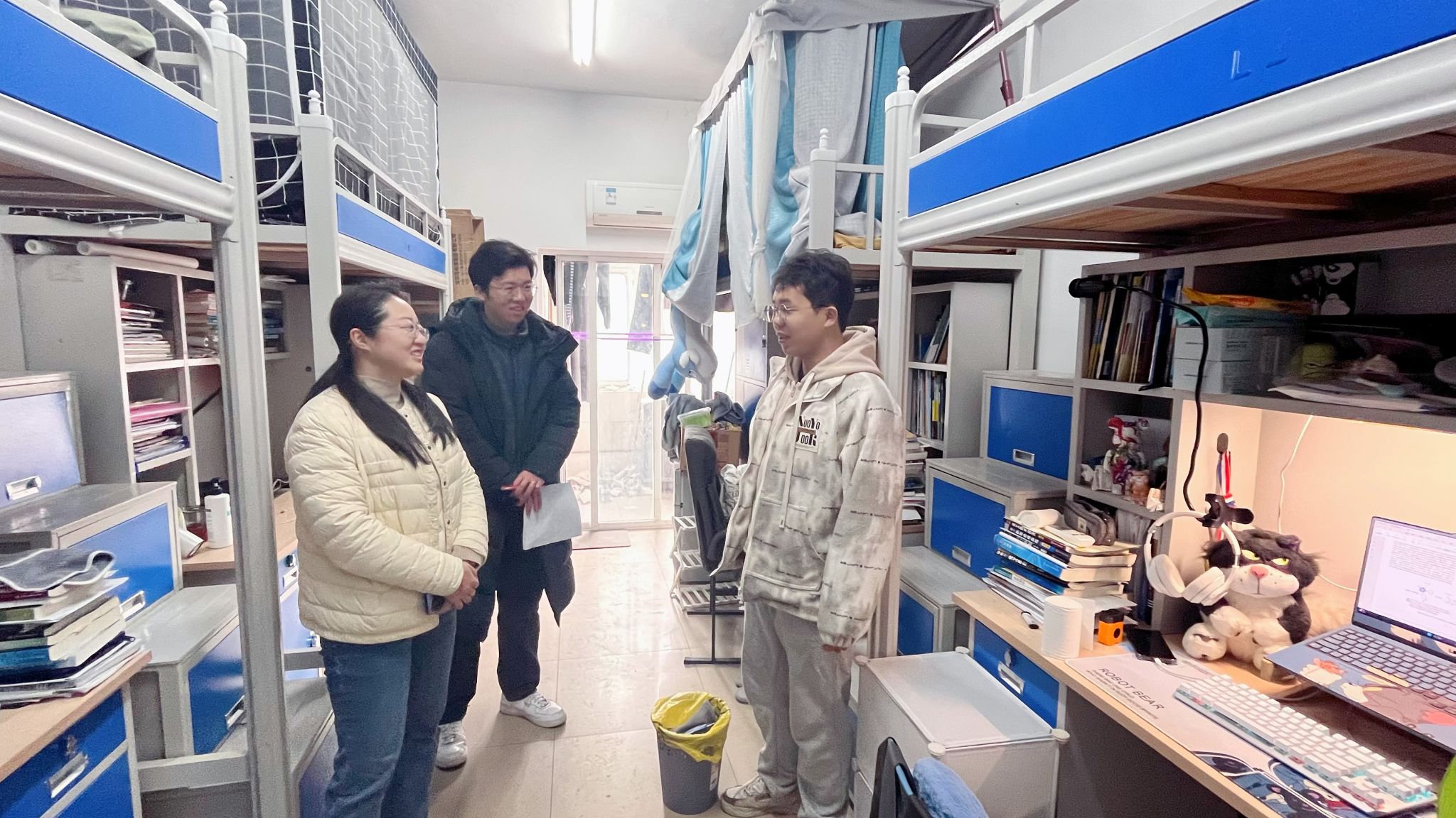 周丹一行进入宿舍,详细询问同学们返校后的生活及学习、科研情况。周丹与同学们亲切交谈:“回校后是否适应?食堂的饭菜是否可口?有没有困难?要注意保暖呀!”她叮嘱同学们要守好安全底线,注意消防、财产、交通等方面的安全。对即将要实习的同学,叮嘱大家要遵守纪律,一切行动听老师指挥,要注意实习期间的安全。老师们认真查看每一间宿舍,对环境整洁、布置温馨的宿舍给予肯定与表扬,面对存在不足的宿舍,给出切实可行的整改方向,鼓励同学们共同营造舒适的居住空间。