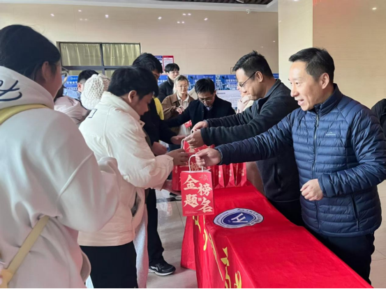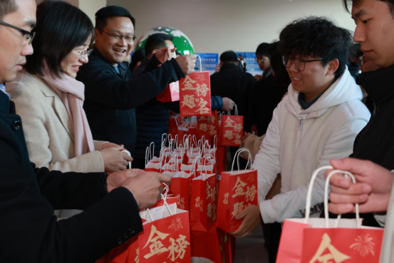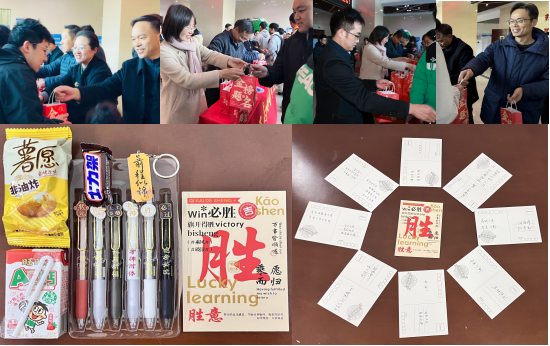 温馨氛围中,领导老师为考研学子送上定制“加油大礼包”。礼包外印“金榜题名”“前程似锦”金色字样,内藏寓意鲜明的实用好物:“考神附体”水性笔、“梦想之门”钥匙扣、学弟学妹手写祝福明信片,还有象征“旺气十足”的AD钙奶、“如愿以偿”的薯愿薯片及“能量补给”的士力架,每一件都承载着公司的殷切关怀。同学们手持礼包笑容满面,纷纷表示将带着这份温暖与鼓励全力以赴,冲刺考研不负公司期许。