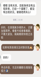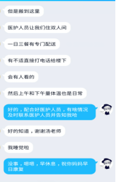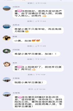 对于各年级因确诊或疑似、发热被隔离的员工,在不影响治疗的情况下,随时保持线上沟通,加强思想引导、心理疏导和学习生活指导,疏导和稳定员工的情绪。2016级黄同学自2月3日起连续出现发热症状并居家隔离治疗,辅导员每日与员工及家长联系,时刻关注其治疗情况。该生于9日经医院检测确诊为新型冠状病毒感染的肺炎患者,且出现体温39℃、血氧饱和度低、呼吸困难、咳血等危急情况,因医院床位紧缺暂时在家排队等位。得知相关情况后公司党委副书记周丹第一时间向公司、公司汇报,同时向校医院寻求医疗支持,并与员工所在社区取得联系,时刻与其家人保持联络,安排辅导员填写人民日报守望相助通道。次日,该同学入院光谷同济医院。“还是要进一步密切关注黄同学的身体及心理变化,做好员工的心理疏导工作。请转告黄同学,公司领导对他的健康状况都很关心,为他加油打气,叮嘱他要多卧床休息,坚持吸氧,好好吃饭,保持阳光心态,争取早日战胜病毒,早日康复。”她不忘叮嘱辅导员。
