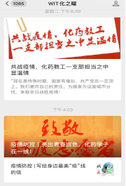 提高政治站位,当好疫情防控的宣传员当前,新型冠状病毒感染肺炎的防控工作正处于关键时期,公司把打赢疫情防控阻击战作为当前的重大政治任务来抓,全力做好疫情防控各项工作。公司学工及时关注最新疫情动态,利用公司官方网站、WIT化之曜微信公众号、钉钉平台等,推送《众志成城,共渡难关——致英国365集团网站师生的一封信》《共同战“疫”,党员先行——致英国365集团网站全体师生党员的倡议书》《新型冠状病毒防控指南》《化药学子为武汉加油微视频》等,及时有效地向师生宣传防治信息,引导广大师生正确认识、科学预防、正视疫情,增强自我保护意识,提升自我保护能力。发表《共战疫情——化药教工一支部担当之中显温情》《疫情防控——亮出青春底色,化药学子在一线》等文章,宣传公司师生在抗击疫情期间,用爱铸牢抗“疫”防线的先进典型事迹,弘扬正能量,为打赢疫情防控阻击战凝聚人心、鼓舞士气。