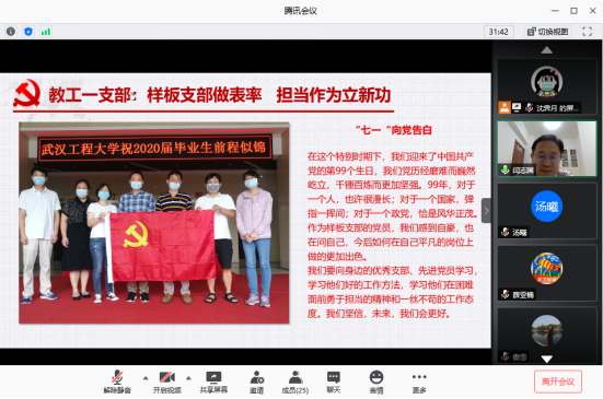 活动期间,全国样板党支部——教工一支部书记闫志国,通过讲述教工一支部党员教师在疫情期间爱心捐款、深化课程思政、积极参与毕业生返校工作等事例,汇报了疫情期间样板支部的示范作用,表明党员教师要增强必胜之心,立足教书育人本职工作,不断提升工作本领和能力,用行动展现共产党人政治本色,打造样板支部品牌工程。