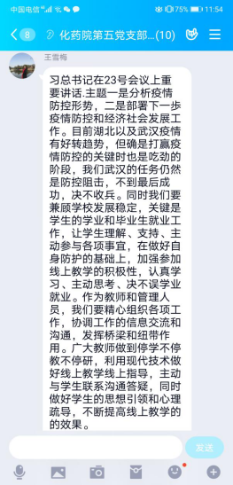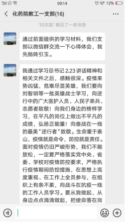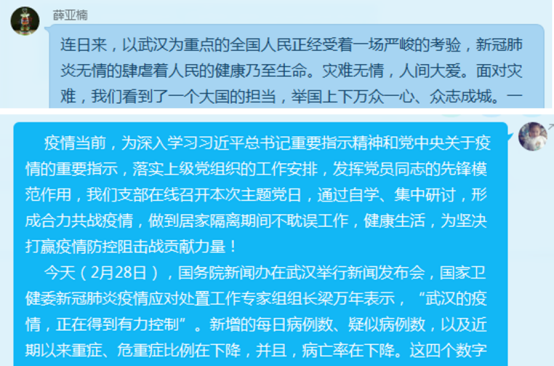 特殊时期,各支部党员们也在支部群里送出了自己对于抗疫一线、对武汉、对祖国的祝福,表达了对战胜此次疫情的坚定信心和美好祝愿。