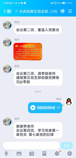 主题党日活动期间,教工一支部书记闫志国、科研二支部书记谌伟民在支部微信群、QQ群就“同心抗‘疫’,党旗飘扬”为主题为支部党员们讲授了一次线上微党课。党课传达学习了习近平总书记在统筹推进新冠肺炎疫情防控和经济社会发展工作部署会议上的讲话精神、习近平总书记在中央政治局常委会会议研究应对新型冠状病毒肺炎疫情工作时的讲话等重要内容,讲述了此次战“疫”期间冲在一线的优秀共产党员的战“疫”事迹,学习他们担当、敬业、奉献的精神。