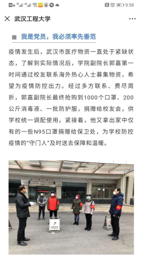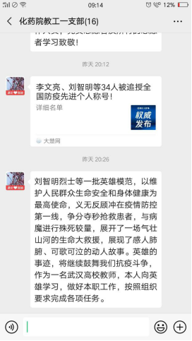 教工各支部通过支部群里集中学、全体党员自觉学的形式,重点学习《中共湖北省委关于追授刘智明同志“全省优秀共产党员”的决定》和抗“疫”一线优秀共产党员事迹,营造出学习先进、争当先进的良好氛围。主题党日活动中,教工四支部共同学习了支部党员干部、“有关人才计划”郭嘉教授向员工会捐赠物资、主动申请参加社区疫情防控工作的事迹,畅谈心得体会;教工二支部、科研二支部则通过学习强国、QQ群围绕所在支部党员李雁博、龙秉文两位“湖北省教育厅有关人才计划学子”积极报名工大社区疫情防控志愿工作的事迹,交流自己的所闻所感。