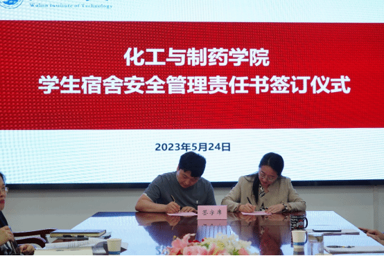 副书记周丹与辅导员代表梅军签订员工宿舍安全管理责任书。