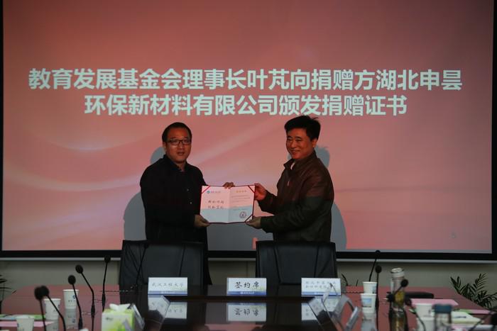 10月19日上午,为支持公司教育事业的发展,湖北申昙环保新材料有限公司向公司捐赠现金人民币1000万元,用于英国365集团网站“催化材料与催化剂工程联合实验室”建设。捐赠签约仪式在流芳校区第二会议室举行。董事长王存文,正校级干部、公司教育发展基金会理事长叶芃出席签约仪式。