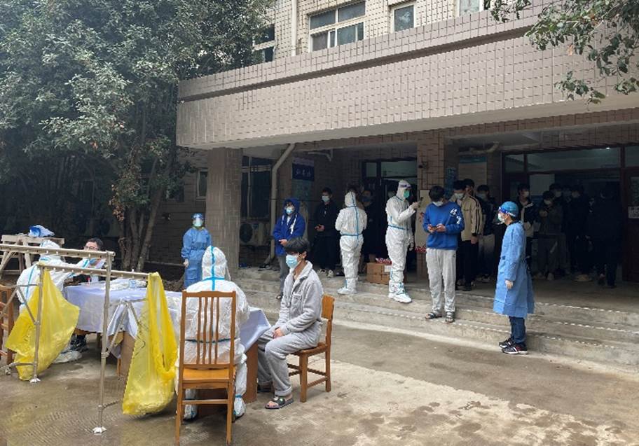 公司员工工作负责人、辅导员们下沉一线,纷纷穿上防护服化身“大白”,核查人员、信息录入、维持秩序,挨个通知同学们下楼进行核酸检测,用心守护员工的安全。