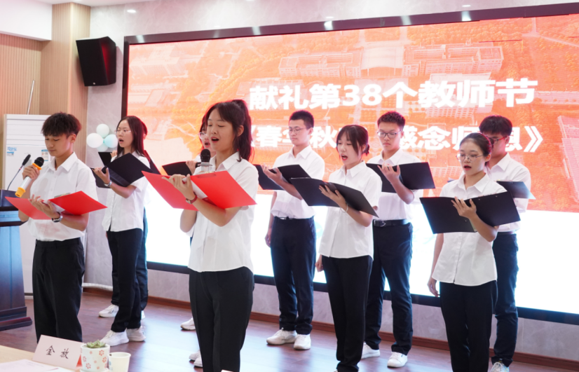 “一支粉笔,写就您人生的轨迹;两鬓染霜,谱成您人生绚丽的乐章”,公司12名新生代表声情并茂地朗诵了《春华秋实,感念师恩》,并向参会的老师献上了鲜花,献礼第38个教师节!