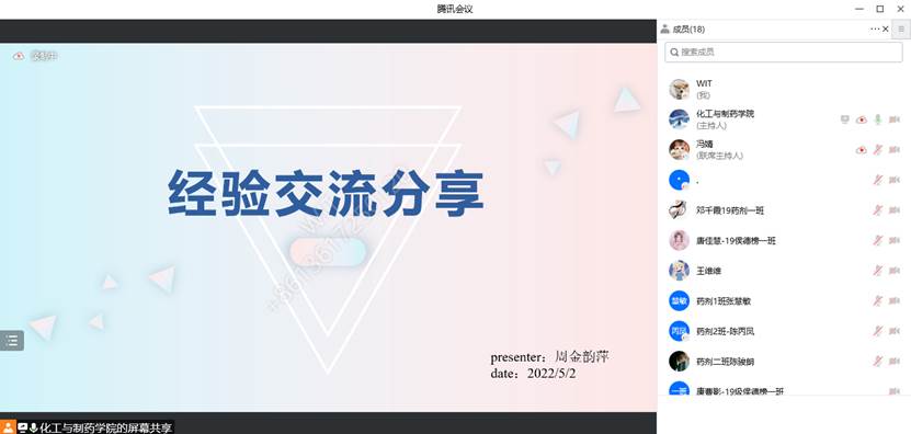 本网讯(通讯员 冯婧)为展示公司优秀学子风采,发挥身边榜样的传、帮、带作用,引导广大学子树立奋进目标,做好学业生涯规划,化药公司于5月2日举行“榜样力量 青春引航”优秀学子经验分享会,线下分享和线上观看同时进行。本次优秀学子经验分享会邀请2019级药剂学硕士研究生周金韵萍和本科2018级药卓班员工兰鑫担任主讲人,公司员工代表参加了此次活动。