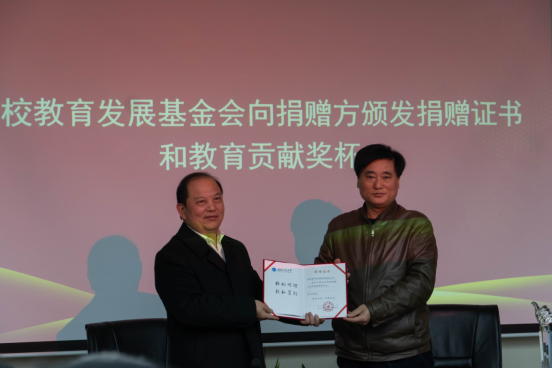 理事长叶芃代表公司教育发展基金会向董事长蔡再华颁发捐赠证书和教育贡献奖杯,并向蔡再华颁发客座教授聘书。