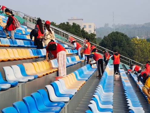校运动会前,许志伟志愿服务队联合“爱在天涯”公益志愿社、“机电红齿轮”志愿服务队、光能数理公司志愿者协会和校志愿者协会一同对操场全部座椅进行清扫,以全新的整洁姿态迎接运动会。公司团委员工会每一位成员从运动会伊始,就活跃在工大的每一个角落。训练陪同、物资供应、医疗防护、如影随形,感谢在背后默默奉献的同学们!