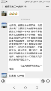 与此同时,公司教工三支部党员古双喜等教师也积极行动起来,伸出援助之手,加入抗疫爱心捐赠队伍。党员教师们纷纷表示,钱虽然不多,但代表了同志们为疫情防控工作贡献一份力量;目前要先做好自身防护、不信谣不传谣,为身边亲友做出良好示范,为控制疫情做出实实在在的贡献。