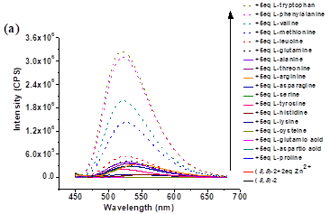 古双喜/朱园园博士团队与美国弗吉尼亚大学Lin Pu教授一起合作,设计合成了多个结构全新的手性分子探针,并发现其中一个分子探针对多种手性氨基酸均有史无前例的高识别能力,它将对映选择性荧光增强比(ef值)这一关键指标提高了一个数量级。该荧光探针能用于结构多样的手性氨基酸的光学纯度测定。