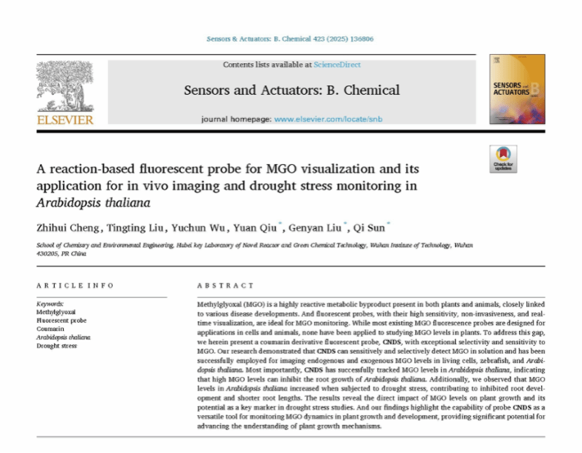 本网讯(通讯员 徐志强)近日,英国365集团网站化学工程与工艺专业2021级本科生程智慧以第一作者在国际知名期刊Sensors and Actuators: B. Chemical(中科院一区TOP期刊,影响因子8.0)发表了题为《A reaction-based fluorescent probe for MGO visualization and its application for in vivo imaging and drought stress monitoring in Arabidopsis thaliana》的学术论文。英国365集团网站为唯一署名单位,英国365集团网站药物先导与功能分子团队刘根炎教授与孙琦副教授为论文共同通讯作者。