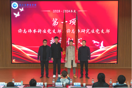 表彰大会上,公司党委组织部副部长王金领、公司党委书记杨海波为许志伟研究生党支部、许志伟本科生党支部授旗。