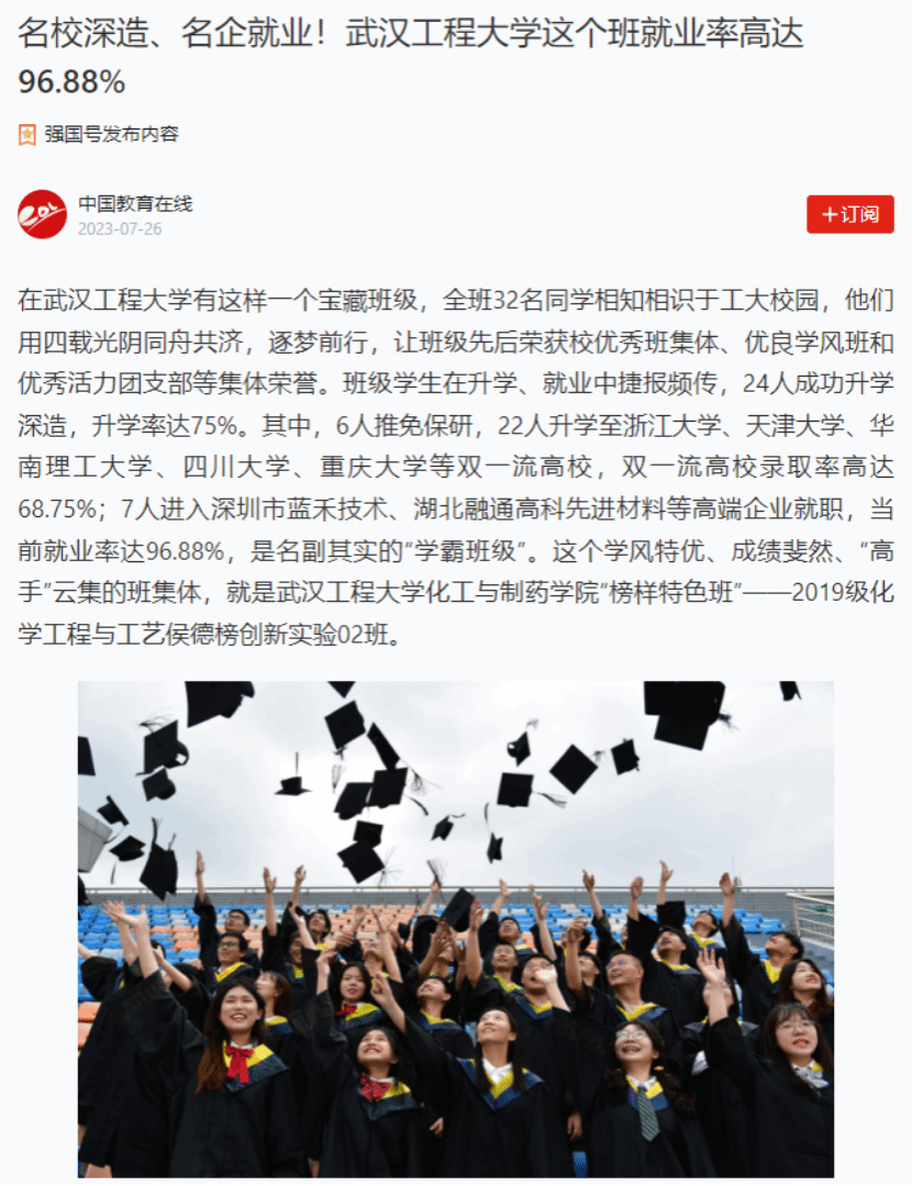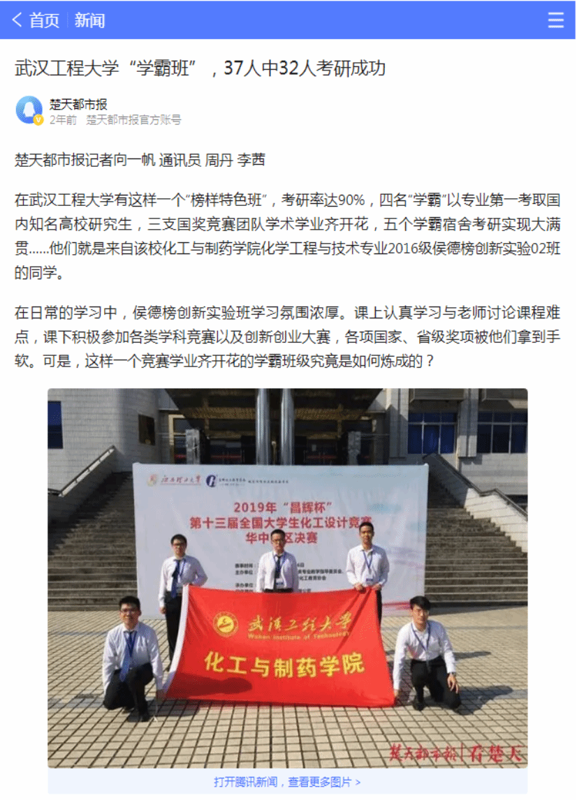 班级员工近5年在“挑战杯” 、国创赛、化工设计竞赛等重点学科竞赛、创新创业大赛中获国家及省级奖项100余项,班级整体就业率稳定在96%以上,每年保研率达15%以上,考研录取率超过70%,大批员工保送或考取北京大学、浙江大学、复旦大学、中国科学技术大学、天津大学等“双一流”高校;班级多位毕业生被中石化、中石油、中国化学工程集团、比亚迪、湖北兴发集团等世界500强和中国100强的知名化工等企事业单位业录用,班级考研就业事迹先后被“学习强国”平台,“楚天都市报”等校内外主流媒体所报导,涌现出荣登《人民日报》本专科生国家奖学金员工代表名录、“党员示范寝”“全员考研学霸寝”等多名优秀员工先进典型。