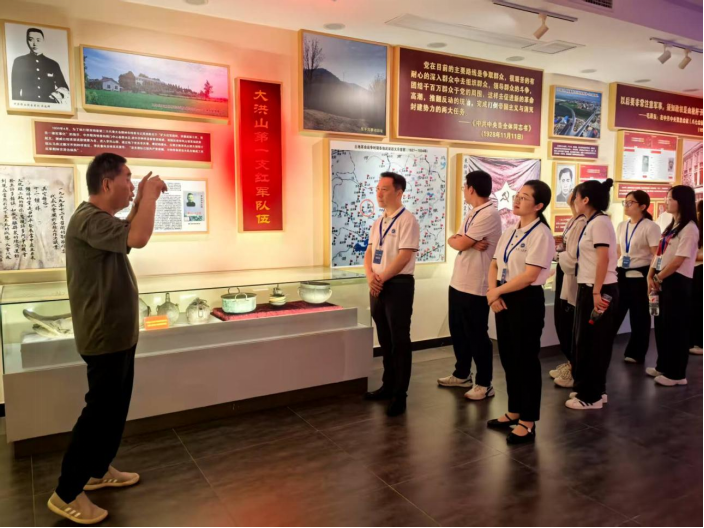本网讯(通讯员 翟森稳)为贯彻落实习近平总书记考察湖北重要讲话精神,弘扬大别山精神、抗洪精神、抗疫精神,传承红色基因、弘扬时代精神 。7月24日,公司党委书记杨海波、副书记周丹、教授龙秉文、创新创业中心主任李辉、辅导员翟森稳以及本硕员工代表一行13人组成的暑期社会实践团,赴钟祥市大洪山革命历史纪念馆开展“赓续红色血脉,汲取奋进力量”主题实践活动。