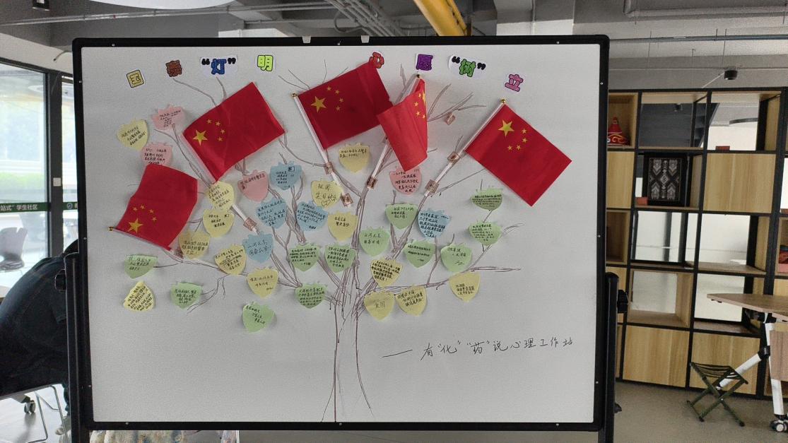 活动中,公司“化”“药”说心理工作站指导老师刘悦薇,带领站长俞皓天、副站长刘雨,与同学们一起开展了以“国泰‘灯’明,心愿‘树’立”的主题活动,师生们在国庆、中秋知识问答中穿梭于岁月长河,于《我和我的祖国》的合唱声里抒发赤子深情。一张张写满对祖国繁荣昌盛的期许、对亲友顺遂安康的祈愿的心愿卡,化作了一树璀璨的“心愿花”,让家国情怀与人文温度在此间交织绽放。