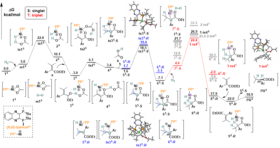 曾婕老师通过密度泛函理论(DFT)计算对完整催化循环进行了系统分析,构建了反应的自由能剖面。计算结果显示,催化循环始于镍前驱体与H₂的协同活化,形成关键的镍氢物种;随后底物通过羰基与金属中心配位,引导烯烃以特定取向进入反应位点。值得注意的是,通过对关键过渡态和中间体进行相互作用区域指示函数分析(IRI),作者发现,形成主导构型的过渡态中存在数量更多、分布更合理的C–H···H–C型范德华力。正是这些看似微弱但可累积的范德华相互作用,显著稳定了优势构型对应的过渡态与中间体,最终实现了产物的高对映选择性。