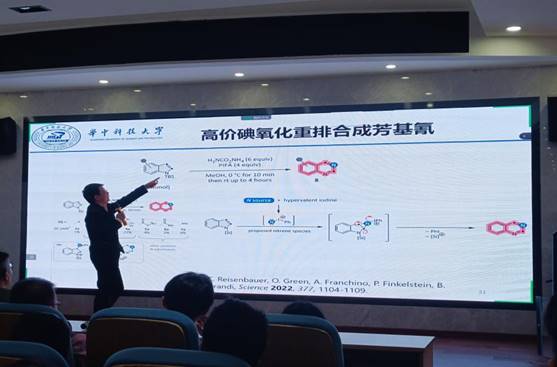 首先,王老师从选择性对有机化学的意义引出今天的报告主题,并从三个方面进行介绍:第一部分介绍了通过柱层析和位阻控制反应的选择性,以及选用吲哚骨架和氧化反应的原因;第二部分为基于吲哚骨架进行的一系列氧化反应,并详细介绍了高价碘氧化重排合成芳基氰,Grob重排高价碘氧化合成喹啉新骨架,金/光接力氧化重排合成喹啉新骨架,金/光接力氧化构建脲类螺旋,金/光接力氧化分子编辑;第三部分详细介绍了碱促进的炔烃氧化脱碳反应,选择性2位取代咔唑合成方法以及1.3.4位三取代咔唑合成方法。