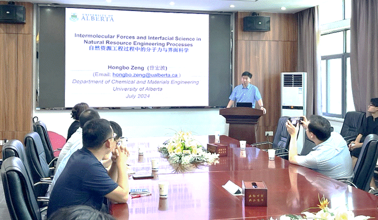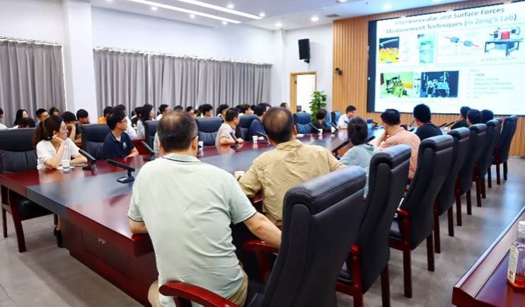 报告中,曾宏波详细介绍了矿产资源、环境工程、化工和生物化工过程中分子力与界面现象的机理,并通过生动的案例展示了这些科学原理在矿物浮选、冶金工程、尾矿综合利用、软物质材料、自修复材料、自清洁材料、油水分离、电池粘结剂、可穿戴电子器件等功能材料开发中的重要作用。他还与青年教师及同学们交流了如何分解科学问题的思路,并分享了建立可行研究方法的经验,希望大家能高效开展学术研究。在师生提问环节,曾教授耐心解答了各类学术问题,介绍了阿尔伯塔大学科研底蕴、平台和学科优势,以及前往该校访学交流的要求和途径,并邀请公司师生前往交流学习。