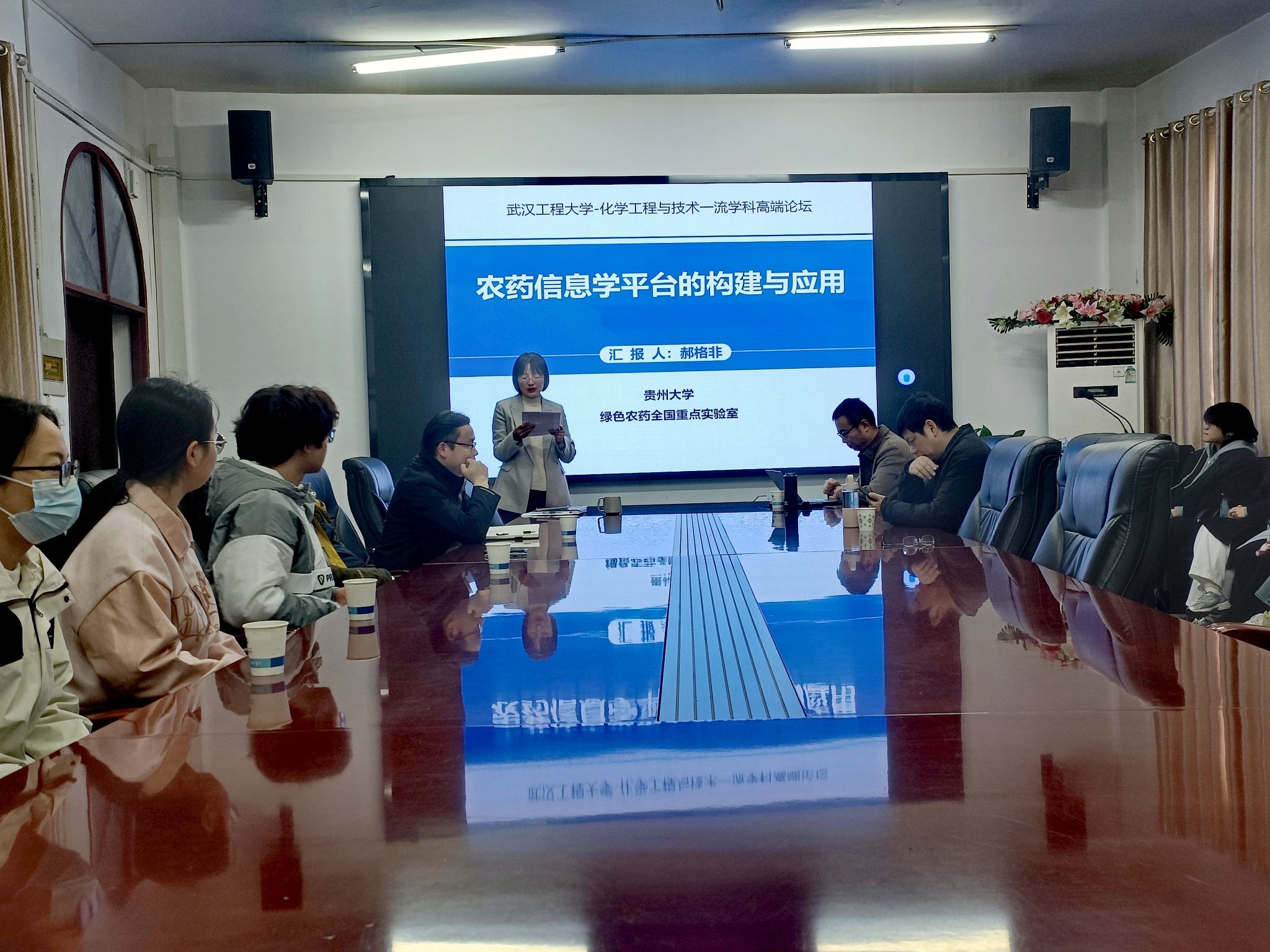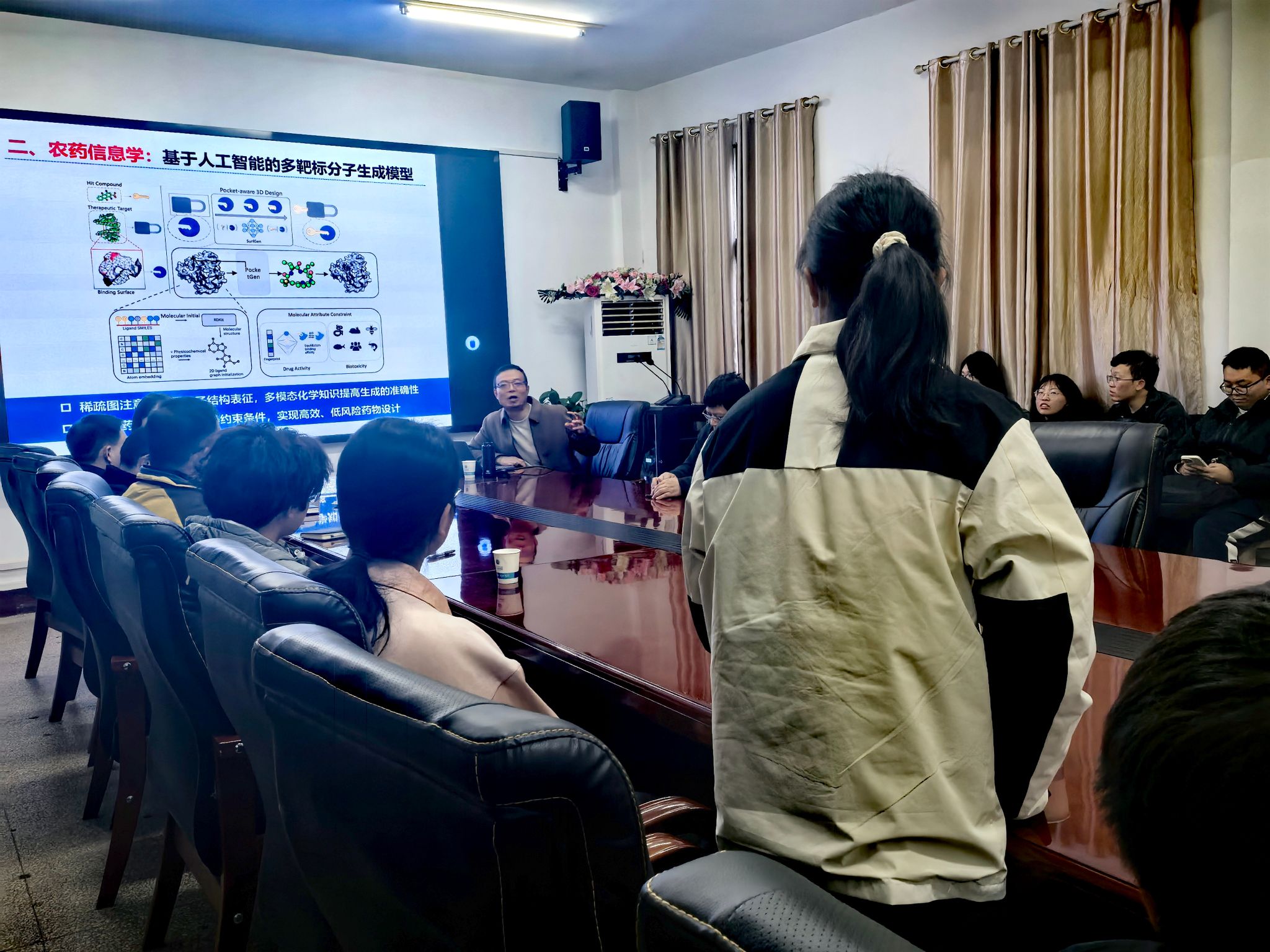 郝教授与参会的老师和同学们就中国−斯里兰卡茶叶绿色防控技术、人工智能的多靶标分子生成模型等研究热点进行了热烈的学术探讨与交流。