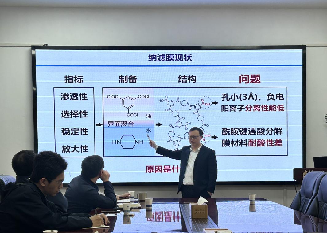赵强教授以《强聚电解质离子分离膜》为题,围绕国家战略需求,阐明盐湖与废电池提锂对保障新能源供应链安全的重要意义,并针对高镁锂分离、耐强酸环境等关键难题,提出基于纳滤膜的阳离子分离技术方案。深入剖析传统聚酰胺纳滤膜的性能瓶颈,详细介绍了团队通过单体改性、结构设计与工艺优化实现提锂膜性能突破及规模化制备的创新成果。赵强教授还结合公司产品实践,分享了“宽严相济”的育人理念,勉励同学们勤奋治学、潜心科研。